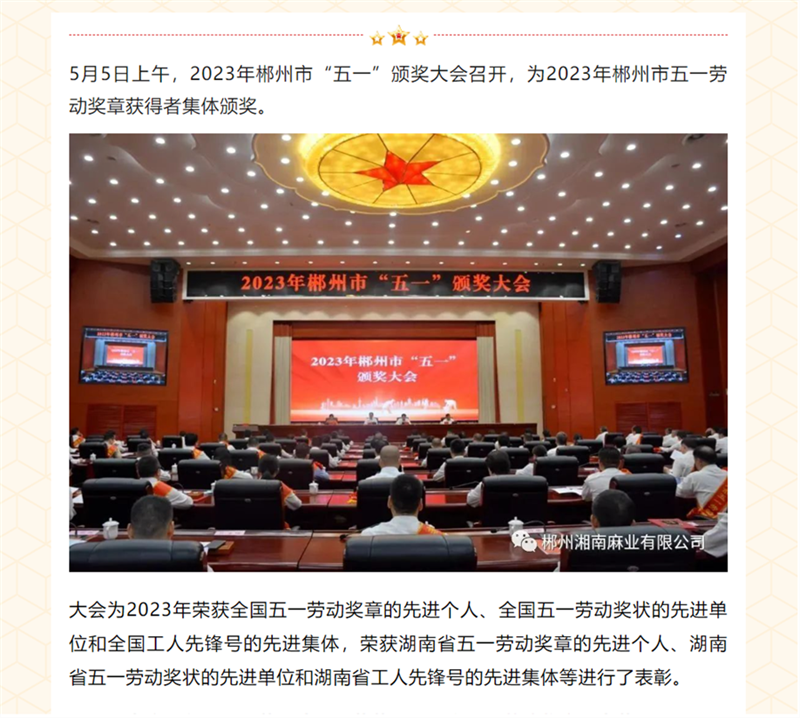 • 喜報(bào)丨郴州湘南麻業(yè)黃友清同志榮獲“郴州市五一勞動(dòng)獎(jiǎng)?wù)隆惫鈽s稱(chēng)號(hào)