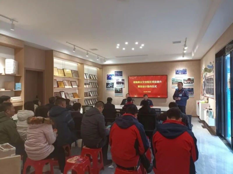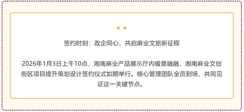 2026年1月3日上午10點,湘南麻業(yè)產(chǎn)品展示廳內(nèi)暖意融融,湘南麻業(yè)文創(chuàng)街區(qū)項目提升策劃設(shè)計簽約儀式如期舉行。核心管理團隊全員到場,共同見證這一關(guān)鍵節(jié)點。